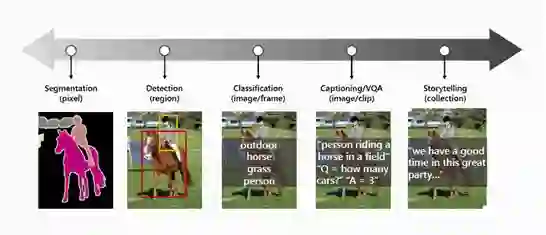 如果把问题按照粒度从小到大排列,可以分为语义分割,目标检测,图片分类,图像标注和storytelling几个层级。语义分割需要理解到确定每个像素属于哪一类,要解决如此难度的问题,需要大量标注,每个像素都要确定其类别,其工作量非常大。目前学术界里面最大的数据集也就20个类目。高一级是目标检测,目标检测不关心每个像素的类别,只关心能不能把目标检测出来。如果不关心目标的位置,只关心图片中具体有哪些目标,就是图片分类。粒度再粗一些,将图片对应标签连成一句话,就是所谓的图像标注。最后一级叫storytelling,能够自动基于图片序列生成一个故事。