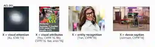 Image Captioning方面的工作可以总结为“Image Captioning with X”,其中的 X 可以是 Visual Attention,Visual Attributes,Entity Recognition,Dense Caption 和 SemanticAttention等模块。 Visual attention希望每个词对应一个物体;visual attributes将被识别出的物体视为句子成分纠正训练;entity recognition可以识别名人或其他实体;dense caption对重复对象中的每一个都可以用一句话来描述。