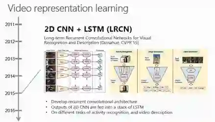 2010年Imagenet已经火起来了,但是把CNN用到视频上始于2014年。当时的想法很直接,就是将视频进行截帧,按照图像的处理方法进行处理。这种做法丢失了时间信息,效果当然不理想,于是怎样将时间信息整合进网络成为后来的研究重点。2014年主要有两个工作,第一个工作的亮点在于将视频视为连续帧的集合进行分类,第二个工作对视频序列中每两帧的密集光流予以特别关注,这两个工作都取得了不错的结果。2015年出现了2DCNN+LSTM,它的亮点在于用LSTM对CNN最后一层的激活在时间轴上进行整合。但是以上工作的准确率提高都不多,于是有人想到在做卷积的时候将卷积核扩展到时域,这就是3D CNN。此后的Temporal Segment Networks则不再从相邻帧中采样,而是从整个视频中稀疏取帧,其效果也有提高。尽管3D CNN的效果很好,但是他有一个缺点就是模型太大,为了解决这个问题,就提出了Pseudo 3D ResNet,基本思想是利用一个1*3*3的二维空间卷积和3*1*1的一维时域卷积来模拟常用的3*3*3三维卷积。