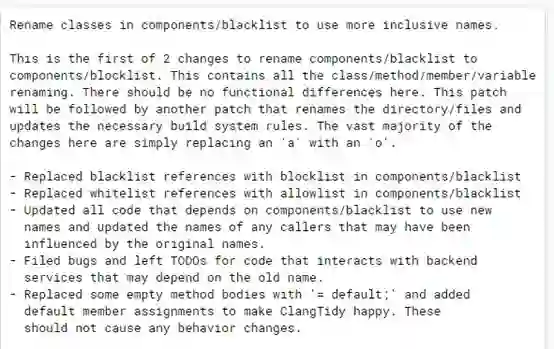 谷歌 Chrome 浏览器的程序人员给出的移除“blacklist”以及“whitelist”等用语的建议和步骤