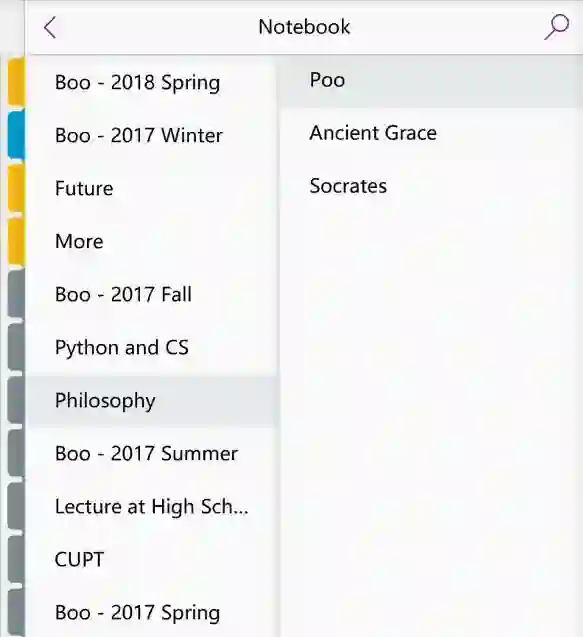 OneNote 笔记本分「笔记本 - 分区 - 页面 - 子页面」几个层级。我的 OneNote 中有许多笔记分区,但并没有用「笔记本」概念进行区分,而是一堆分区按时间顺序垒在一起。每一个分区对应生活中的进行的一个「项目」:比如一门课的上课笔记,分多页记入同一分区,读这本书是为一个「项目」;或者一场活动的策划,各种笔记和材料分多页记入同一分区,这个活动是为一个「项目」。在若干分区之间插入一个以「BOO + 时间」的格式命名的新分区,隔开各个时期创建的分区。而这样的新分区下储存的页面则是日记,记下各个项目的进展情况,以及日常见闻。
