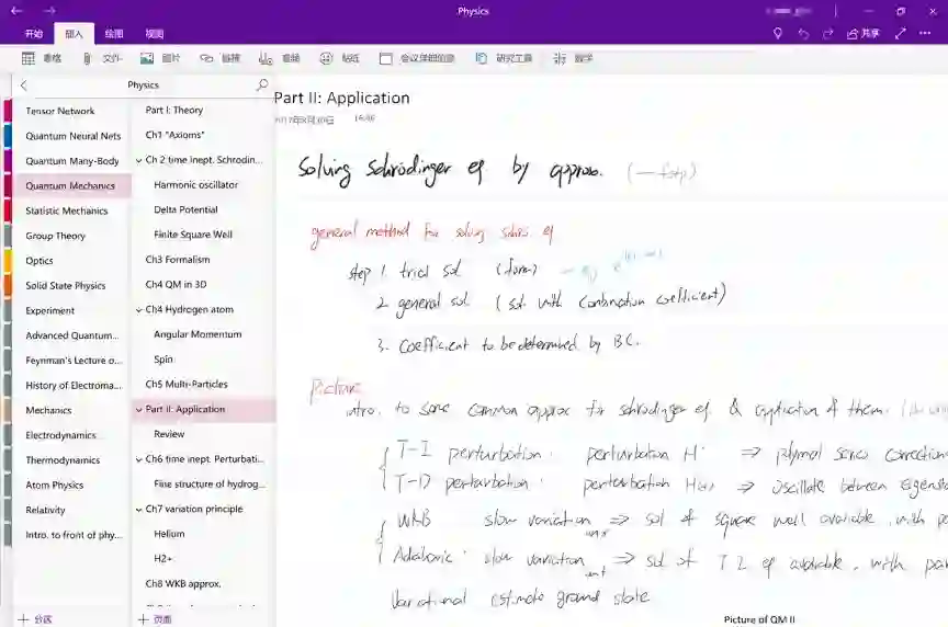 Surface 的一大吸引人之处就是因其与 OneNote组合所带来的强大笔记能力。个人对记笔记的公式输入以及灵活批注的需求注定了我只能用手写笔记。而 Surface + OneNote 的组合不仅很好的满足了我的这些需求,更在许多方面超越了纸笔,为我提供了绝佳的书写想法的环境: