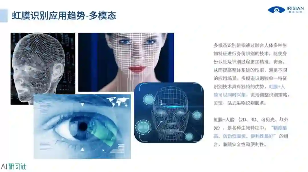 第三个趋势是多模态,虹膜作为单一的可以提供最高识别精度的生物特征,这方面是没什么挑战的,但如果把它和其他特征融合,可能会带来更好的用户使用体验,比如虹膜与人脸,详细讲解请观看视频回放: