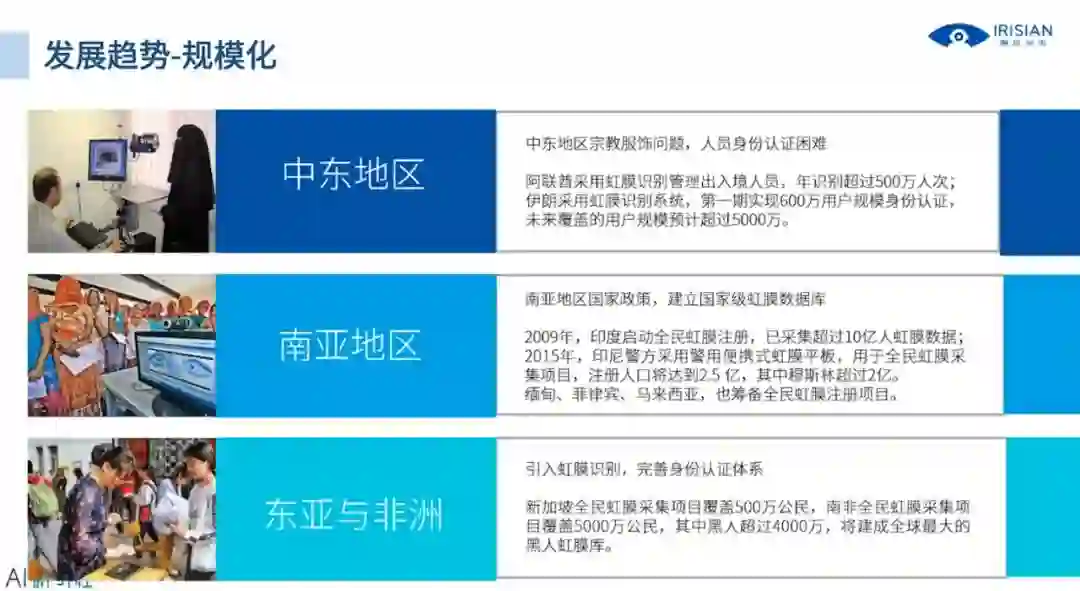 下一个趋势是规模化,在日常生活中我们似乎还没有太多见到虹膜应用的案例,但实际上虹膜目前大规模应用已经成为全球化的趋势,这里给出了三个地区案例,详细讲解请观看视频回放:
