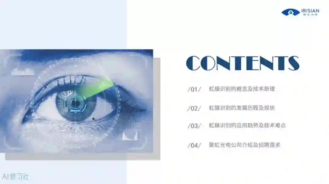 下面开始进入到本次分享的主题,现代虹膜识别技术及其应用。我是来自上海聚虹光电科技有限公司的宫雅卓。