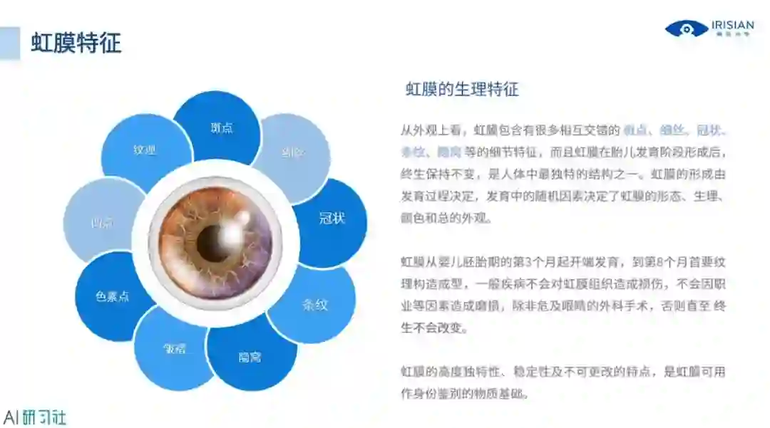 下面我们来看一下虹膜识别的优势,这里总结出了五条优势,如下图,详细讲解请观看视频回放: