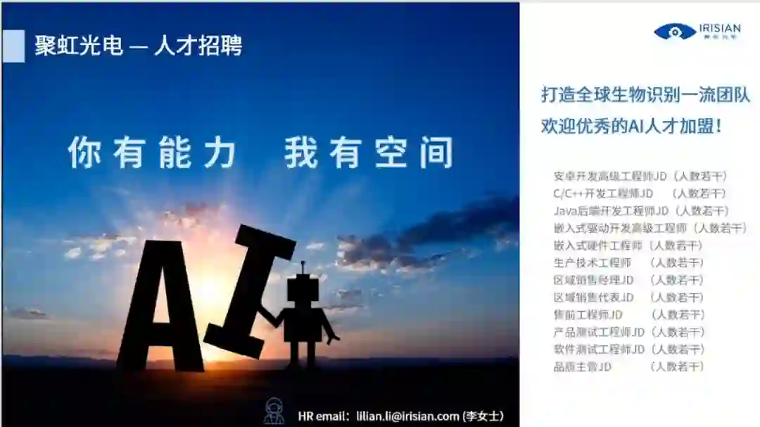接下来讲一下聚虹光电对生物识别人才特别是AI人才的渴求,生物识别总体上是属于人工智能的一个领域,近年来生物识别也受到了极大的关注,从最早的指纹到人脸、从2D人脸到3D人脸这样一个过程迭代,可以预计到虹膜在未来的三五年,应该会成为一个新的技术热点,特别是虹膜和人脸的多模态结合。岗位需求情况如下图所示: