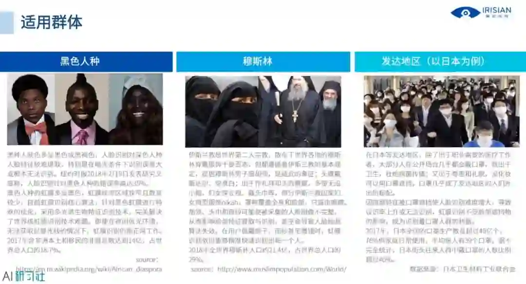 为什么这么多海外国家都采用虹膜识别,它的受众群体有什么样的特性呢?我们做了一个简单的总结,如图所示,详细讲解请观看视频回放: