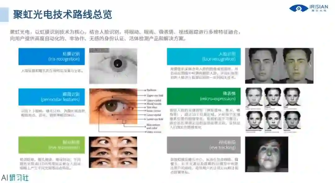接下来看一下聚虹光电技术路线总览,以虹膜识别为核心,同时结合人脸识别,并且将眼动、眼周、微表情视线跟踪进行多维的特征融合,向用户提供高度自动化、非协作、无感的身份认证、活体检测产品和解决方案。可以这样理解,跟虹膜识别相关、跟眼睛周边的动作特征相关的所有交互识别技术都在聚虹的研发范围内,并且我们也取得了一系列的成绩,详细讲解请观看视频回放: