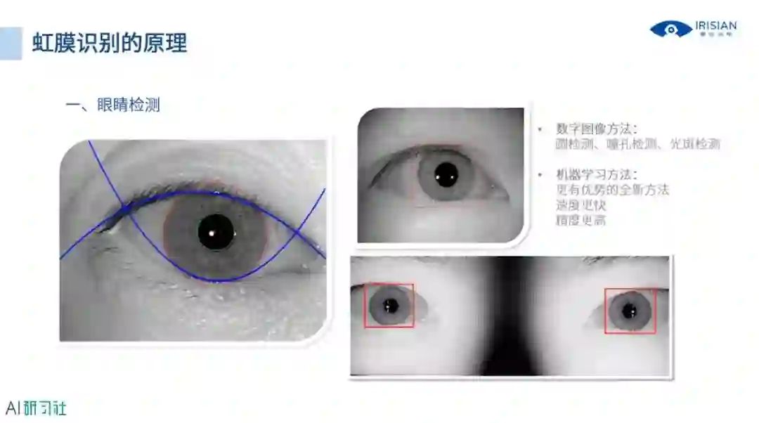 下面我们来看一下虹膜识别中比较关键的步骤,第一步是眼睛检测,在一个非常清晰的大分辨率的图像中快速地找到眼睛,是虹膜识别的第一个算法上的挑战。下图展示了三张图片,有的图像中只有一只虹膜,有的是两只虹膜,如何快速地找到眼睛实际上需要非常复杂的一些算法,我们可以用传统的数字图像处理的方法,比如圆检测、瞳孔检测、光斑检测去辅助判断哪个部位是眼睛。也可以采用机器学习新的方法,在速度和精度上也更有优势。(具体讲解请观看视频回放)