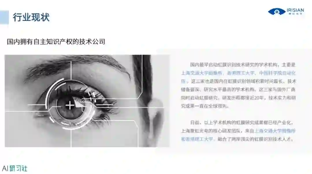 接下来看一下整个行业的现状,国内拥有自主知识产权的虹膜识别公司最早都是学术机构,上海聚虹的核心研发团队来自上海交大图像所和香港理工大学,融合了两岸顶尖的虹膜识别技术人才,详细讲解请观看视频回放: