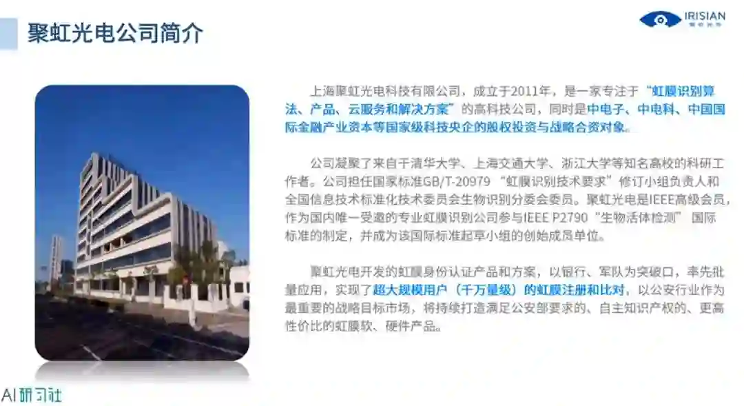首先来看一下公司的简介,聚虹光电是国内最早进行虹膜识别研究的技术团队,如下图所示,详细讲解请观看视频回放: