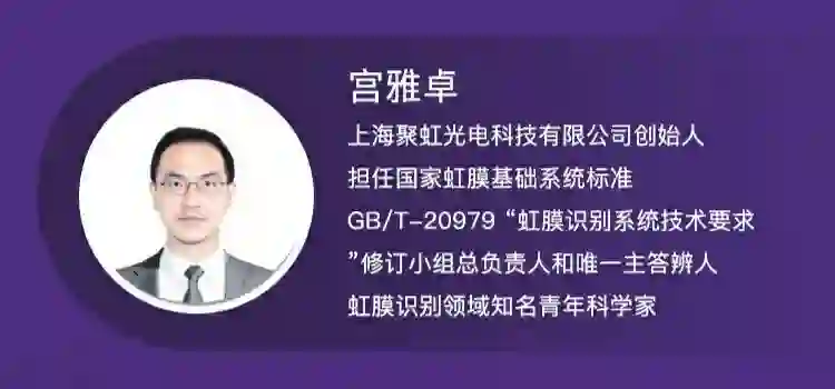 宫雅卓,上海聚虹光电科技有限公司创始人、总经理。自2001年起,专业从事虹膜识别的研究,是国内最早、实力最强的虹膜识别研发团队的核心骨干成员,担任国家虹膜基础系统标准GB/T-20979 “虹膜识别系统技术要求”修订小组总负责人和唯一主答辨人、全国信息技术标准化技术委员会生物识别分技术委员会委员、上海市信息化青年人才协会第一小组理事(副组长),是国内外虹膜识别领域的知名青年科学家。