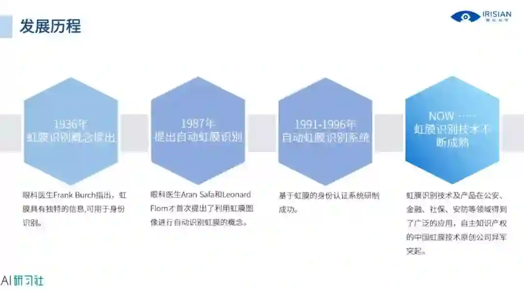 现在我们进入第二部分,虹膜识别的发展历程及现状,首先来看发展历程,如图所示,详细讲解请观看视频回放: