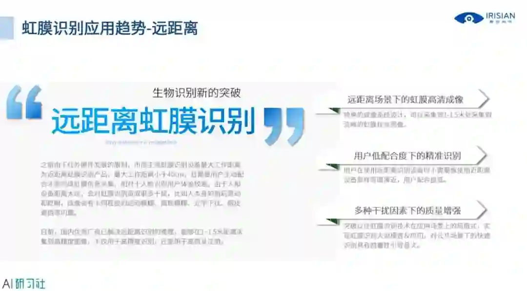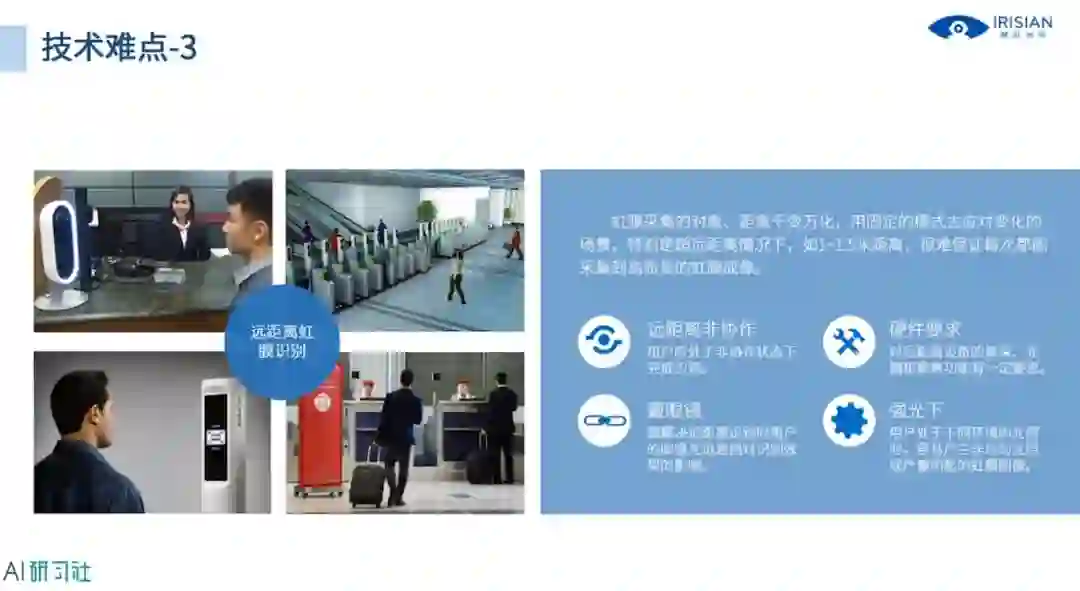 我们再来看第三部分,虹膜识别的应用趋势及技术难点,第一个虹膜识别的应用趋势是远距离。虹膜在最早诞生的时候,成像距离是非常近的,大约只有十几到二十厘米的作用距离,最大距离也只有三十到四十厘米,而且需要用户非常配合虹膜识别的采集过程,所以用户的体验并不是很好,在整个识别过程中侵犯感比较强,从而也对虹膜识别的采集以及虹膜识别技术的推广造成影响。详细讲解请观看视频回放: