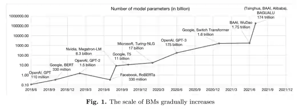 随着BM在CV领域的成功,在自然语言处理(NLP)领域也有类似的研究。然而,自深度学习兴起以来,一个长期存在的问题一直困扰着文本处理。梯度消失和梯度爆炸是自然语言处理中常见的两种导致意外输出的现象。对于NLP中的BM的初步研究主要集中在Word2Vec[17]等浅层网络上。然而,浅层网络无法捕捉词语和句子的各种语义信息。例如,一个多义词在不同的句子中表现出不同的意思,而浅层网络则很难区分。虽然像RNN这样的网络通过包含上下文信息来解决上述问题,但深度仍然是一个难点。随着Transformer 网络结构的出现,在自然语言处理领域构建深层网络模型成为可能。在此之后,预训练技术在NLP中取得了一系列的突破。包括BERT[18]和T5[19]在内的大模型BM经过训练,在许多下游任务中获得了最先进的性能。1750亿参数的GPT-3在几个下游NLP任务上表现良好,尤其是生成任务。增大参数尺度使BM模型能够更好地捕获训练数据中包含的语言知识。GPT-3的研究表明,扩展模型大大提高了与任务无关的、少样本的性能,有时甚至与之前最先进的微调方法[20]相比具有竞争力。GPT-3模型的重要发现促进了大模型及其相关技术的研究。大模型的参数规模从数十亿快速增长到数万亿,并保持着急剧上升的趋势。通过不断增大模型参数,研究人员试图探索大模型的性能改善极限。