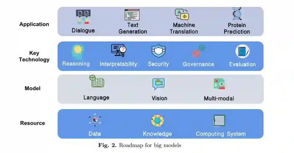 随着深度学习的快速发展,对多个下游任务进行大模型(Big Models, BMs)训练成为一种流行的范式。研究人员在BM的构建和BM在许多领域的应用方面取得了各种成果。目前,缺乏对BMs总体进展进行梳理和指导后续研究的研究工作。本文不仅介绍了BM技术本身,还介绍了BM技术运用BMs进行BM训练和应用的前提条件,将BM评审分为资源、模型、关键技术和应用四个部分。我们在这四个部分介绍了16个具体的BM相关主题,它们是数据、知识、计算系统、并行训练系统、语言模型、视觉模型、多模态模型、理论与可解释性、常识推理、可靠性与安全性、治理、评估、机器翻译、文本生成、对话和蛋白质研究。在每个课题中,我们对当前的研究进行了总结,并提出了未来的研究方向。最后,我们从一个更全面的角度总结了BM的进一步发展。