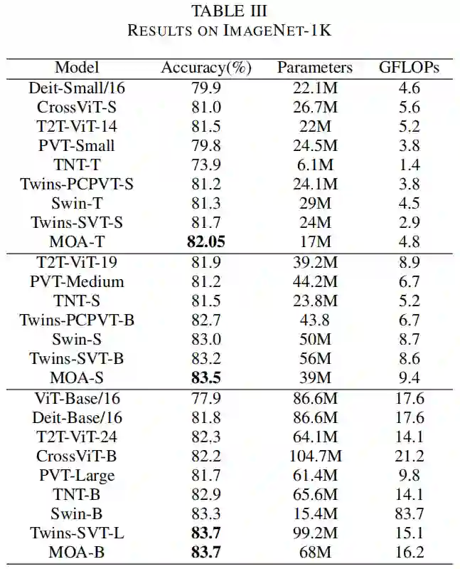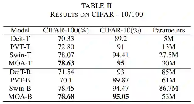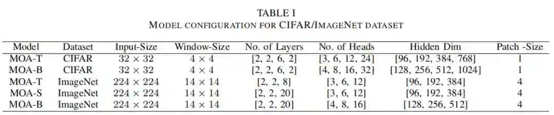 根据之前的工作,为ImageNet数据集构建了3个版本的模型:MOA-T、MOA-S和MOA-B,而为CIFAR -10/100数据集构建了2个版本的模型:MOAT和MOA-B,因为它非常小。