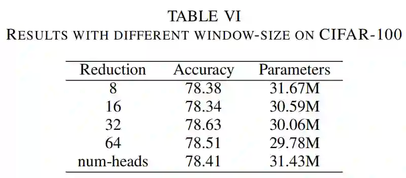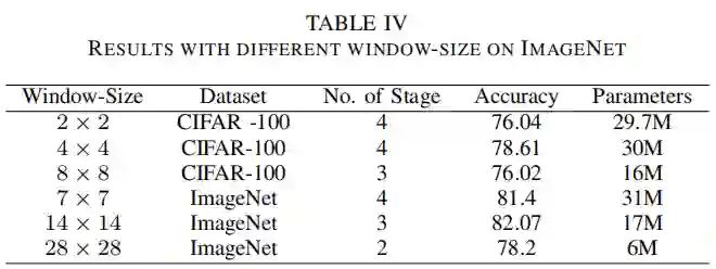 作者在模型中实验各种window size,发现4 x4和14 x14 window size适用cifar-100和ImageNet数据集,分别如表4所示。此外,删除window size大于的阶段特征图大小显著降低参数的数量。