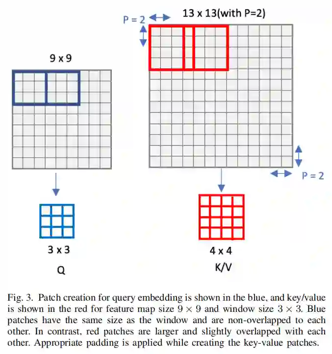 提出的MOA模块以基于局部窗口的注意力组生成的输出作为输入。它首先将其转换为一个二维特征图,并将其投影到一个新的低维特征图中。与ViT类似,投影的特征图被划分为固定数量的Patches。与ViT相比,query和key的patch size不同。query中的patches的分辨率与在Local Transformer层中使用的window size相同。相比之下,key patch的分辨率略大于query patch,且存在重叠。MOA全局注意力模块的隐藏维度与之前的Transformer层保持相同。因此,生成的特征被直接聚合到前一个Transformer层的输出中。