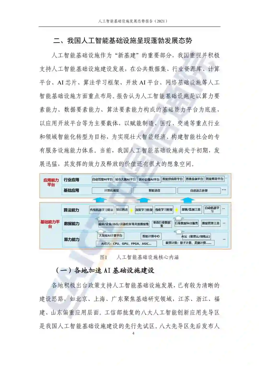 人工智能基础设施作为“新基建”的重要部分,我国重视并积极支持人工智能基础设施建设发展,在公共数据集、行业资源库、计算平台、AI 芯片、算法学习框架、开放 AI 平台、网络基础设施等人工智能基础设施方面重点布局。报告认为人工智能基础设施是以算力要素能力、数据要素能力、算法要素能力构成的基础能力平台为底座,以应用开放平台等为主要载体,以赋能制造、医疗、交通等重点行业和领域智能化转型为目标,为实现壮大智能经济、构建智能社会的专有服务设施能力体系。当前,我国人工智能基础设施尚处于初期,发展迅猛,其发挥的效力及释放的价值还有很大的想象空间。