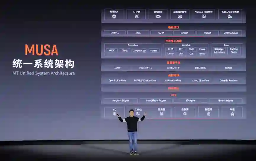在介绍完“元计算”概念后,张建中发布的一系列新产品将发布会推向了高潮。据张建中介绍,MUSA 是摩尔线程产品系列采用的统一系统架构,包括统一的编程模型、软件运行库、驱动程序框架、指令集架构和芯片架构。