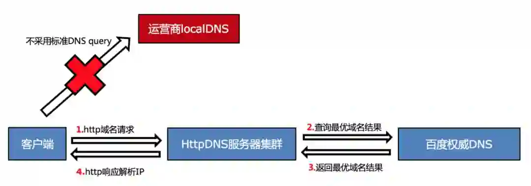 【2】解决了传输层协议的安全性后,我们要解决下域名解析的问题,上面我们提到 HTTPDNS 服务是基于 BGP 接入的,在端上采用 VIP 方式请求 HTTPDNS 数据(VIP 即 Virtual IP,VIP 并没有与某设备存在必定的绑定关系,会跟随主备切换之类的情况发生而变换,VIP 提供的服务是对应到某一台或若干台服务器的),既然请求原始数据需要使用 IP 直连的方式,那么就摆脱了运营商 localDNS 的解析限制,这样即使运营商出现了故障或者被劫持,都不会影响百度 App 的可用性。