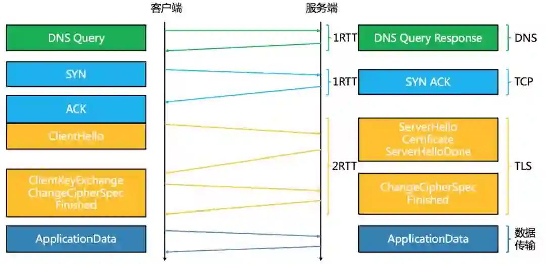 综上所述,DNS,TLS,TCP 握手阶段用了 4 个 RTT 才到了 ApplicationData 阶段,也就是数据开始传输阶段。