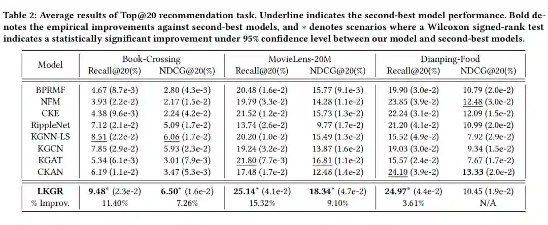 本文提出了一个 KG- 增强的推荐模型,即 LKGR,该模型学习用户和物品的嵌入,以及 KG 实体在双曲空间中的嵌入。本文在洛伦兹流形上提出了一种知识感知的注意机制来区分图节点的信息量贡献,然后通过多层聚集来实现高阶信息传播。在三个基准数据集上的实验结果不仅验证了 LKGR 相对于最近最先进的解决方案的性能改善,而且还证明了所有提出的模型组件的有效性。