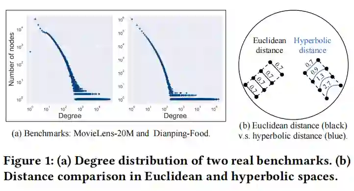 而现有研究表明,对于树状(幂律分布)数据,欧式空间将会获得较高的失真,同样地,传统的基于欧式空间的图嵌入方法可能无法有效地捕获无标度网络的内在层次结构,从而使得节点嵌入高度失真,最终降低了推荐的性能。