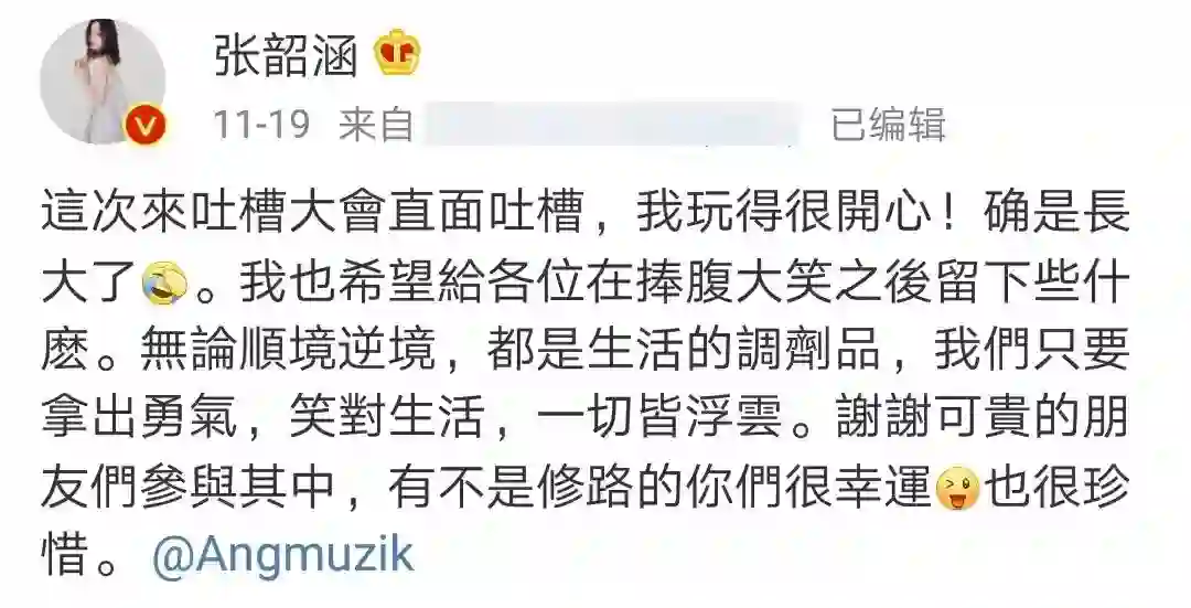 张韶涵表示自己很珍惜“不是修路的朋友” / 微博@张韶涵