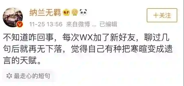 网友调侃自己交友无力 / 微博@纳兰无羁