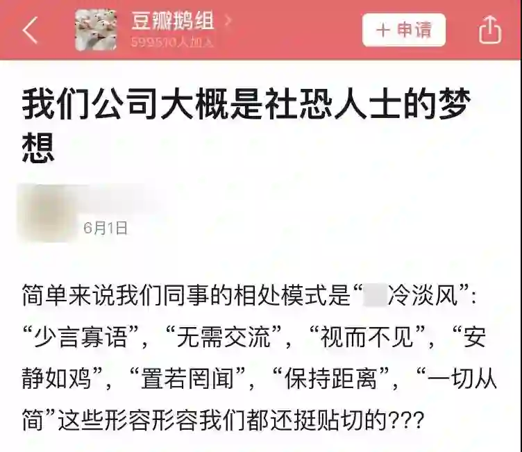 豆瓣有网友发帖表示自己公司就是社恐人士的梦想。