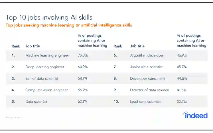 考生选择AI的参考之一就是大厂招聘的数据。据Indeed发布的职位统计,当今公司需求最大十份AI技能工作: