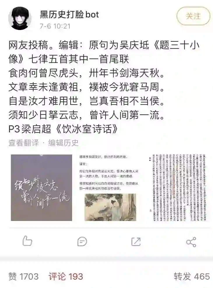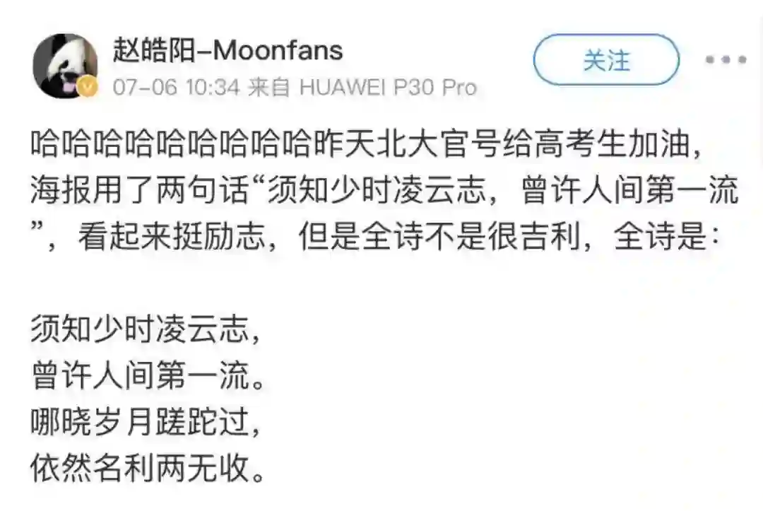 高考前夕还有一件轶事值得分享。北京大学官方公众号,为全国广大学子们发了一句加油打气的诗,读起来就很北大——「须知少时凌云志,曾许人间第一流」。结果却因为这句诗引来了不小的争议。