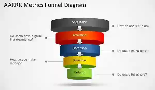 根据不同阶段用户参与行为的深度和类型,我们可以将增长目标拆分并概括为”AARRR”转化漏斗模型,即: