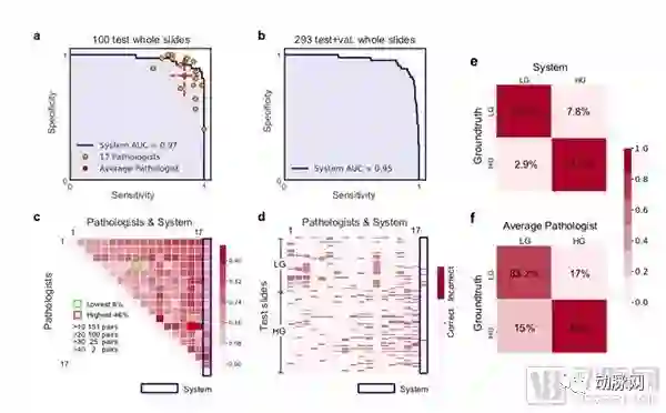 此外,当使用混淆矩阵进行比较(图e,f)时,结果显示系统的平均准确度为94.6%,而病理学家的平均准确度为84.3%。
