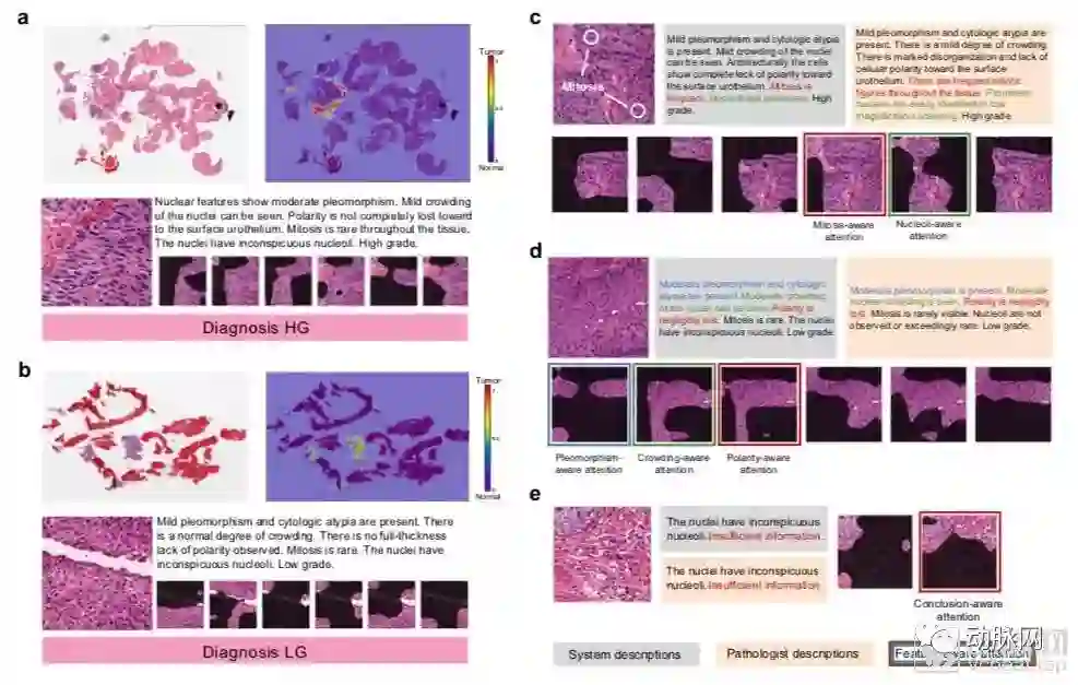 如上图,a、b显示的为全片肿瘤检测结果,c、d、e则为生成的“特征感知注意图”,对诊断细节进行描述。我们可以看到,针对每一张切片,系统在判读后,除了常规地将ROI区域框选出来,还针对不同区域生成了解释性文字。
