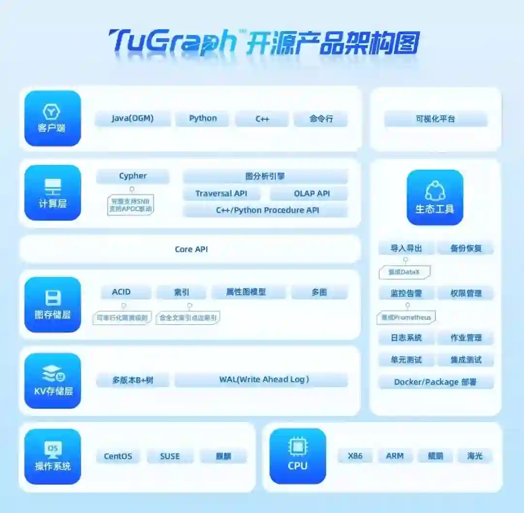 对于大多数的开发者和合作伙伴来说,单机版开源 TuGraph 架构与稳定性、性能,已经足够满足多数场景和数据量的要求,开发者可以聚焦应用层,通过核心层和工具链提供的基础来打造属于自己的 TuGraph 图数据应用。而 TuGraph 商业版本在开源单机版本通用功能之外,将提供数据量更大的分布式版本和高可用服务。