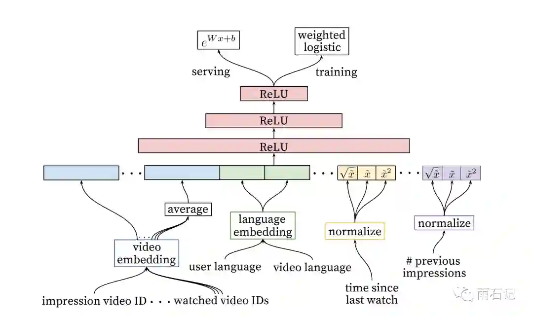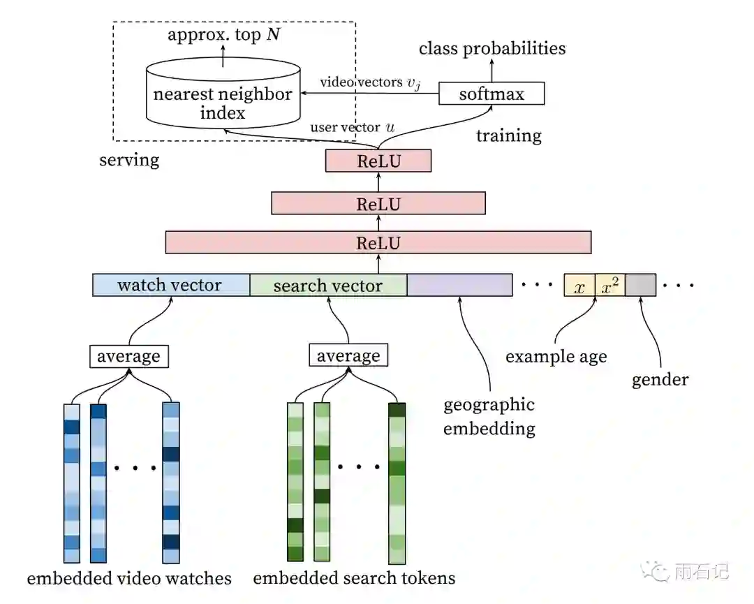 16年往前,生成候选的方法是协同过滤,但是有了神经网络之后,自然要更新模型。在这里,把候选生成建模成了多分类问题。基于用户信息和上下文信息,对每个视频进行预测,看是不是要加入到候选集。
