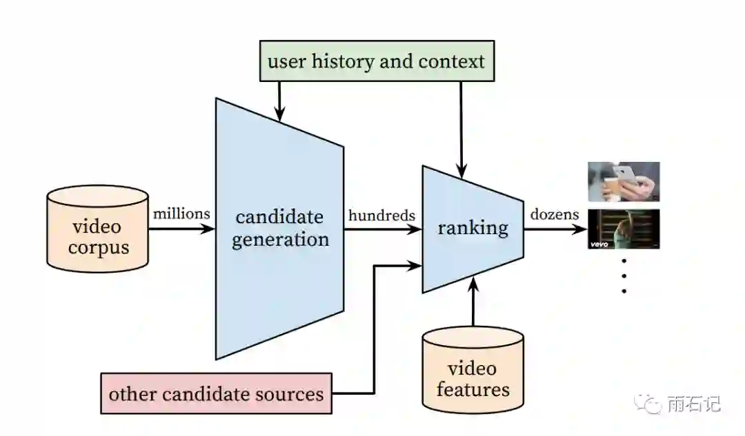整个系统分为两部分,candidate generation和ranking。这点我们在之前已经多次讲过了,candidate generation负责生成候选集,ranking负责精排。