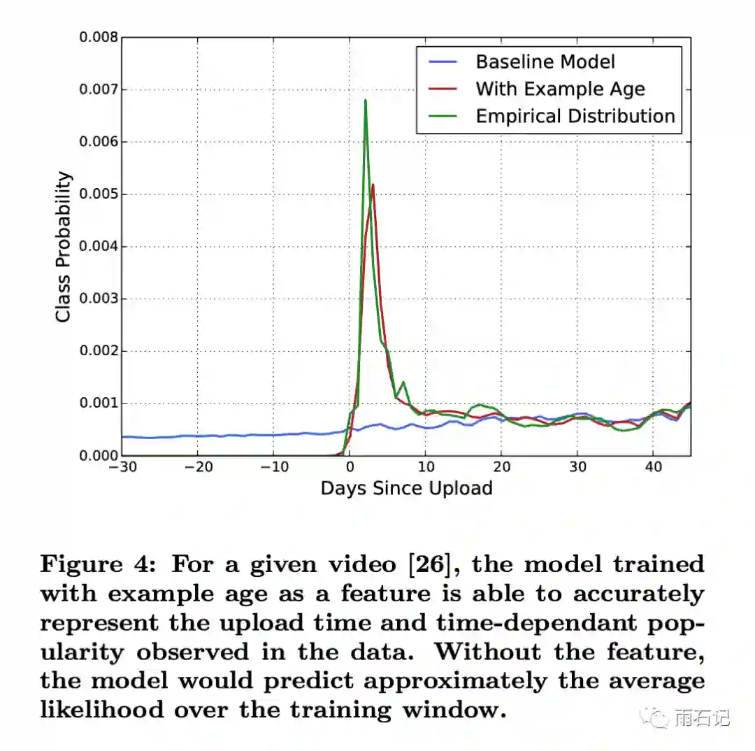 在youtube上,每秒都会有很多新的video被上传,如何对这些视频做推荐非常重要,这就是推荐系统中常遇到的Freshness问题。经过数据分析,发现用户比较倾向于新视频,甚至可以为了新视频而放弃部分相关度。如下图所示,视频被上传的时间和被观看的概率的关系如下,因此,在模型中,需要加入视频的年龄从而使得模型能够正确预测新视频被观看的概率。