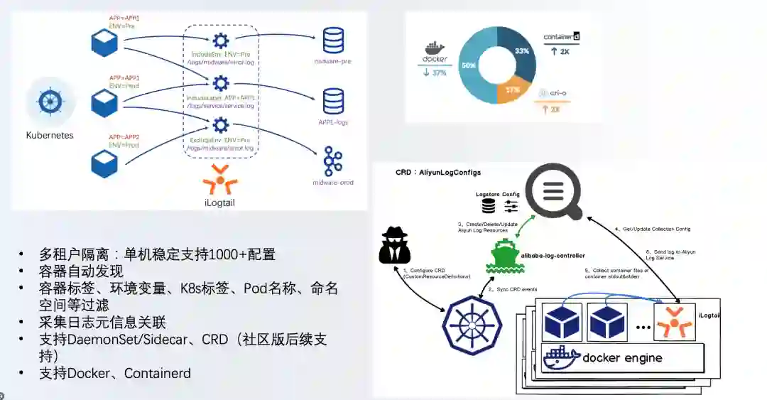 自K8s问世以来,docker运行时一直是主流,但是随着K8s将dockershim移除,K8s官方推荐优先选择containerd 或 CRI-O作为容器运行时。docker份额目前虽然还是主流但是已经在呈逐年下降的趋势,contailerd、cri-o地位逐年都在快速上升。因此,从K8s支持全面性上,iLogtail需要支持主流的运行时,目前已经支持Docker和Containerd两种容器引擎的数据采集。