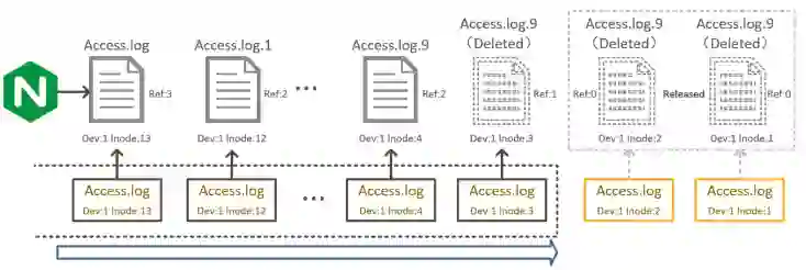 为了实现日志文件的顺序采集,首先需要定义好文件的唯一标识。我们知道在文件系统中,可以通过dev+inode的组合唯一标识一个文件。文件的move操作虽然可以改变文件名,但并不涉及文件的删除创建,dev+inode并不会变化,因此通过dev+inode可以非常方便的判断一个文件是否发生了轮转。但是dev+inode只能保证同一时刻文件的唯一性,当涉及文件快速删除创建的时候,前后两个文件的dev+inode很可能是相同的。因此纯粹通过dev+inode判断轮转并不可行,iLogtail引入了文件签名(signature)的概念,使用日志文件的前1024字节的hash作为文件的signature,只有当dev+inode+signature一致的情况下才会认为该文件是轮转的文件。此外,iLogtail内部也引入了文件轮转队列,保证了文件的顺序采集。