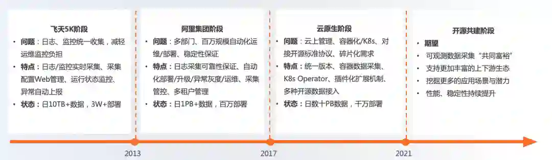 iLogtail的前身源自阿里云的神农项目,自从2013年正式孵化以来,iLogtail始终在不断演进。