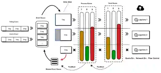 因此我们采用了基于时间片的采集调度方案,使各个配置间尽可能公平的调度,防止采集文件饿死的现象发生。iLogtail将Polling以及Inotify事件合并到无锁的事件队列中,每个文件的修改事件会触发日志读取。每次读取从上次记录的偏移位置开始,并尝试在固定的时间片内将文读取到EOF处。如果时间片内读取完毕,则表示事件处理完成,删除事件;否则,将事件重新Push到队列尾部,等待下一次调用。