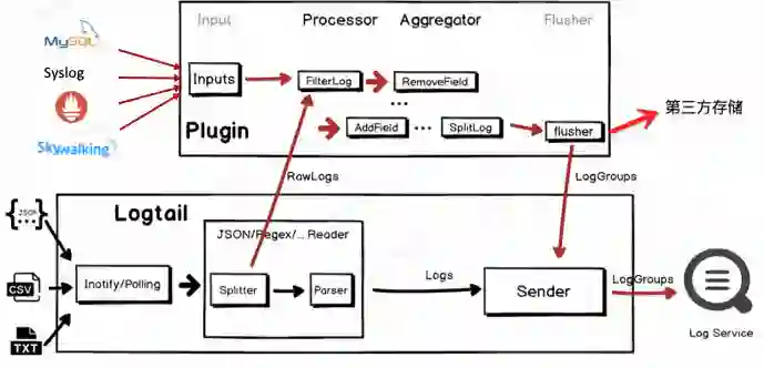 iLogtail进程由两部分组成,一是C++编写的主体二进制进程,提供了管控、文件采集、C++加速处理的功能;二是Golang编写的插件部分,通过插件系统实现了处理能力的扩展以及更丰富的上下游生态支持。