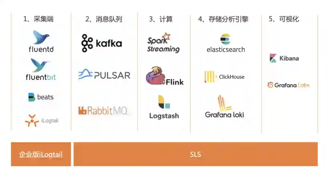 目前行业上主流的可观测开源方案,大概可以分为5个部分。