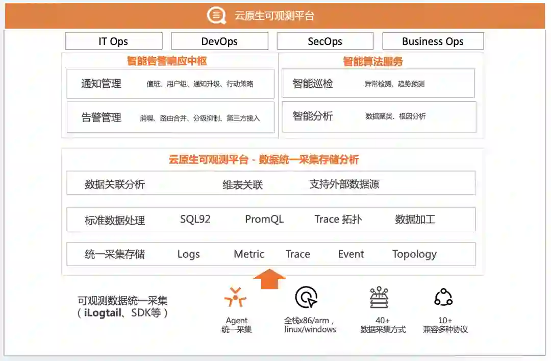 SLS提供了对于Log、Metric、Trace的统一存储分析能力,并且也可以承载流量管道作用,具备强大的数据加工能力,基于SLS可以快速构建出一套云原生可观测平台。智能告警中枢、智能算法服务近一步增强了该平台的智能化水平。用户可以基于此平台,便捷高效的构建各类ITOps、DevOps、SecOps、BusinessOps上层应用。