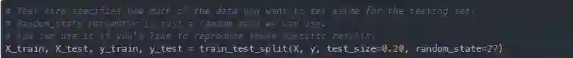现在我们已经有了我们想要的特征和分类,我们可以使用sklearn的train_test_split()函数将数据分割为训练集和测试集: